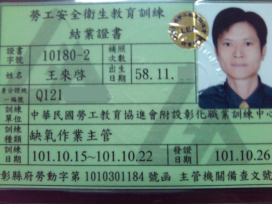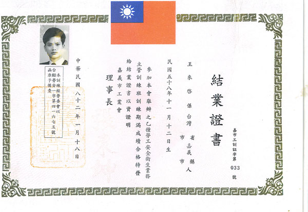 勞工安全衛生結業證書